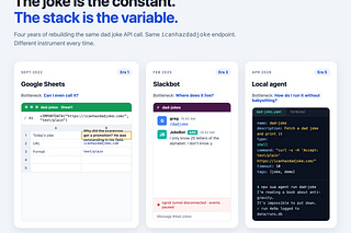 Four years of the same dad joke API on five different stacks — and what each rebuild actually taught me. Read: "Everything starts looking like a toy…