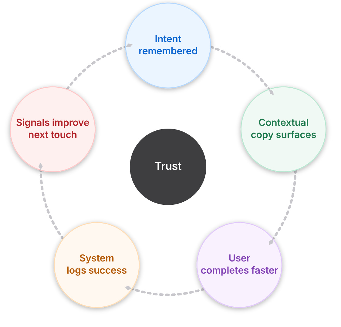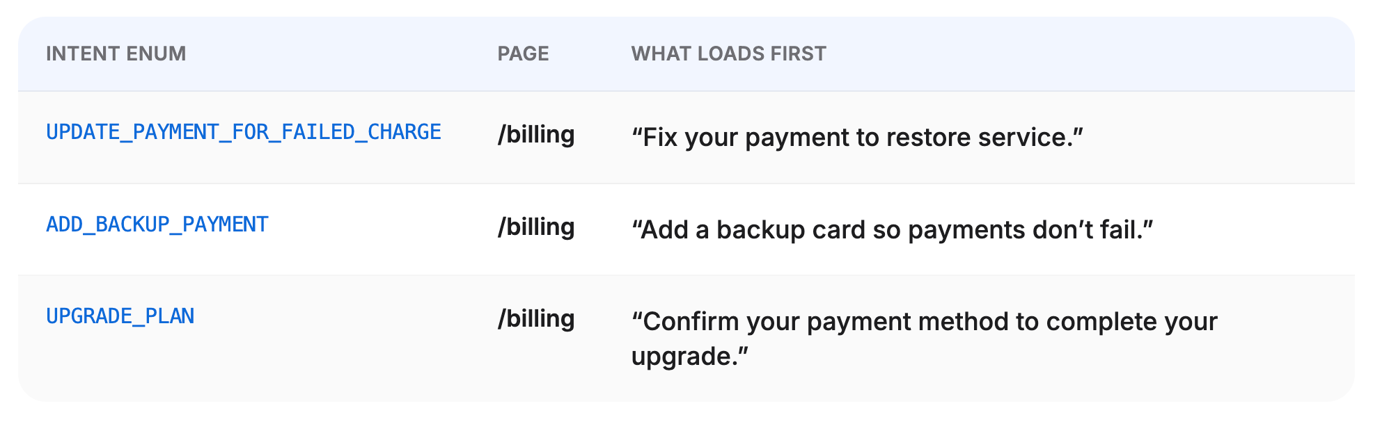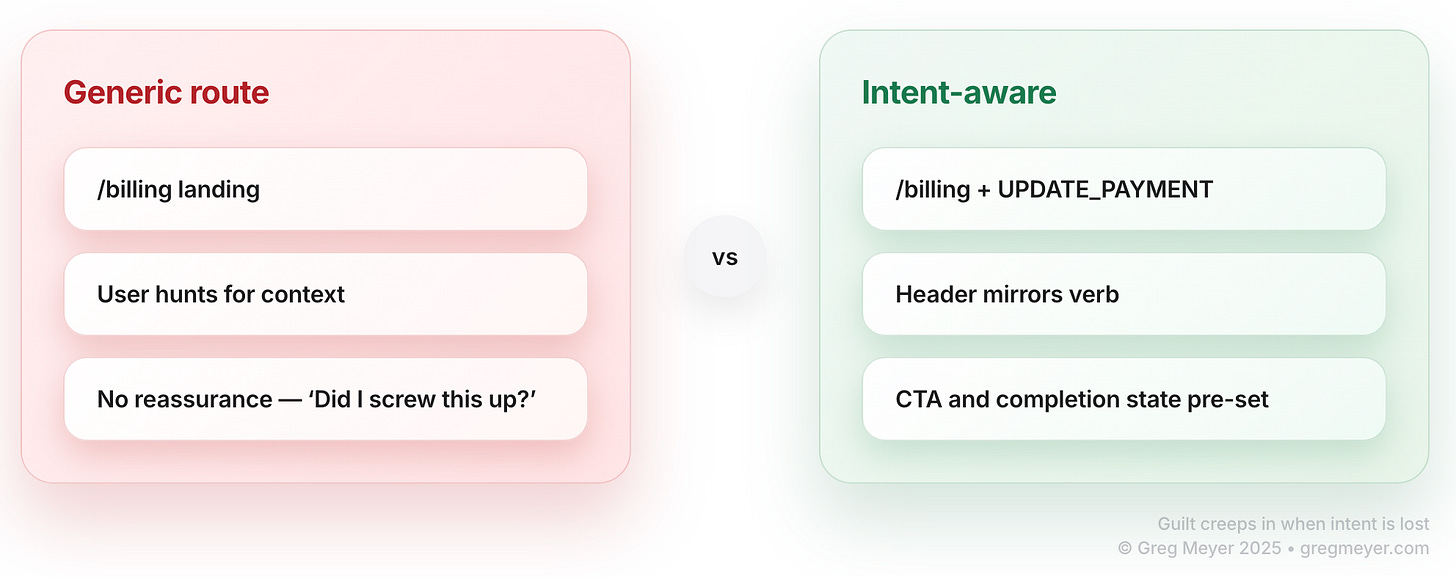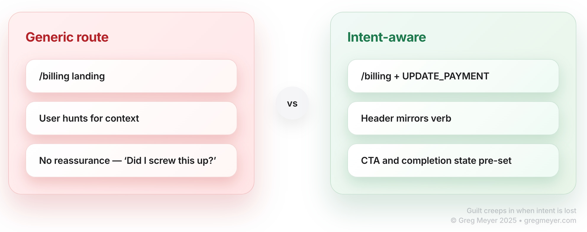 “This page doesn’t make sense.” The page reads IntentContext and mirrors it in heading, copy, and CTAs. Users feel oriented, not lost.