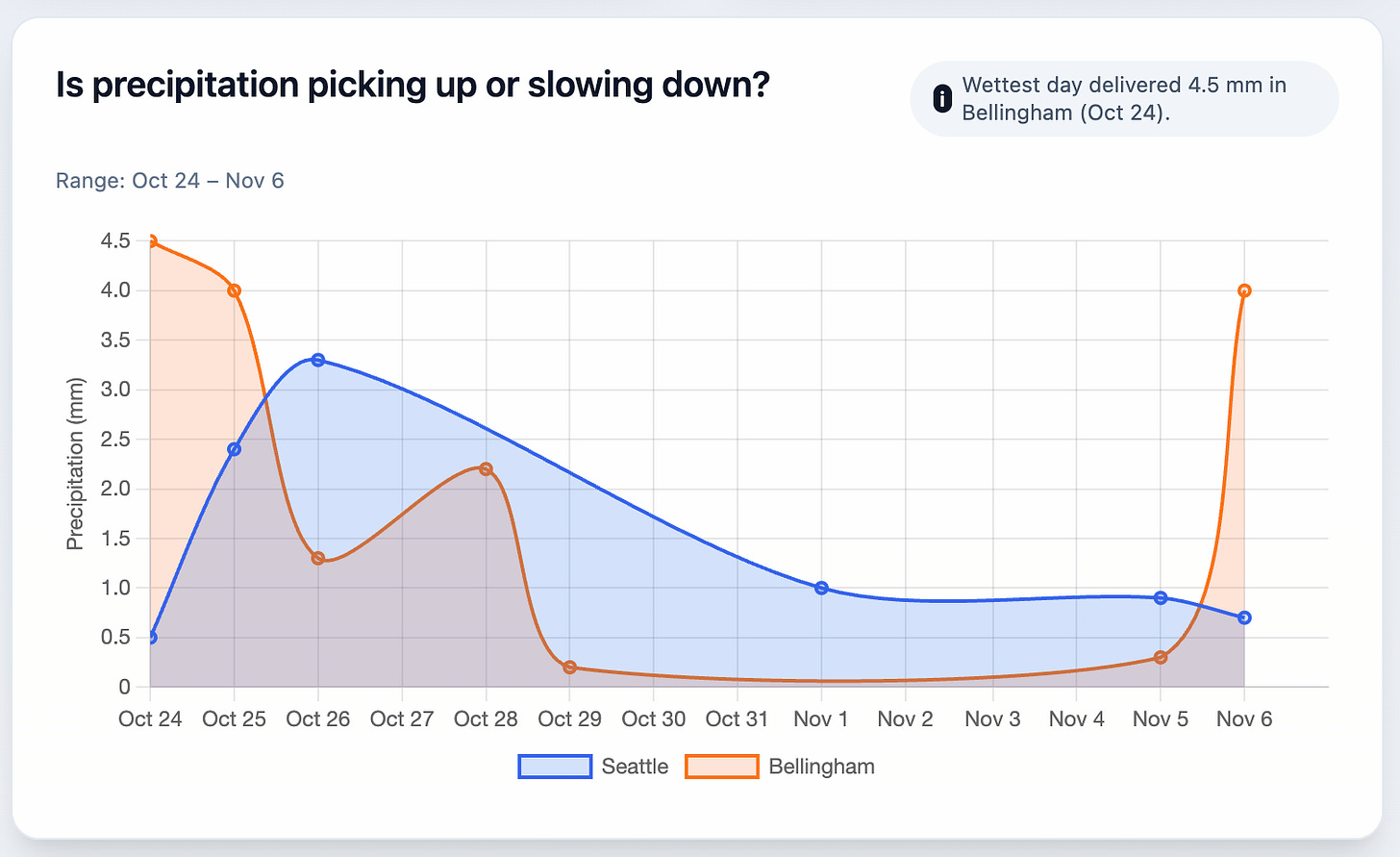 Your dashboard wouldn’t be any good if it didn’t answer the questions well. You can see clearly over this date span that we had a pretty rainy weekend in Bellingham, WA on November 6, and it wasn’t quite as rainy in Seattle, WA (about 80 miles away).