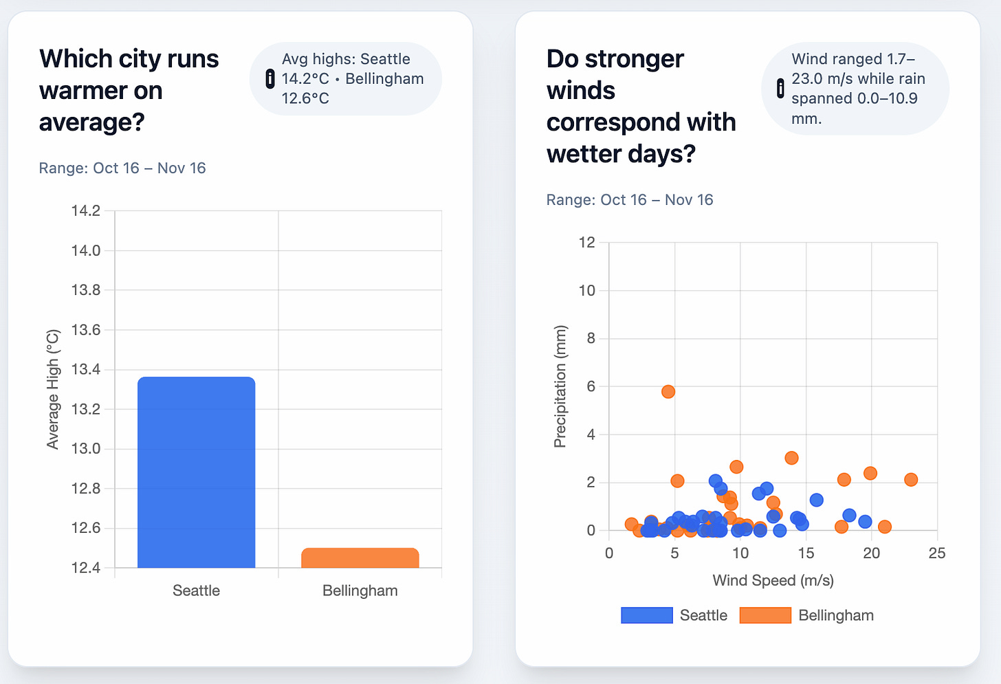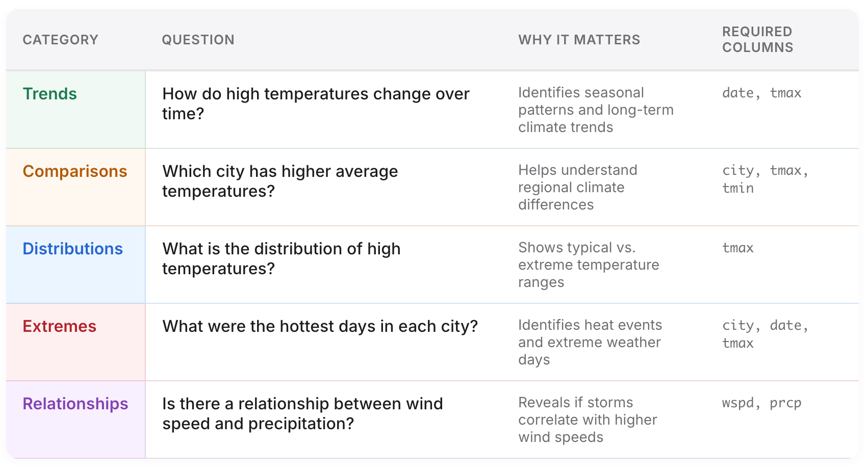 Weather is the “hello world” dataset for dashboard literacy. Nothing about this workflow is weather-specific, and you can apply the ideas of time-series data to other kinds of datasets that you’ll see in the workplace.