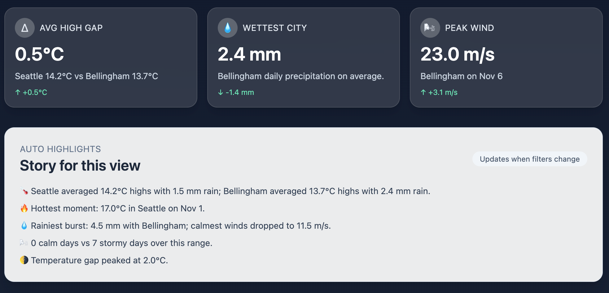 Three KPI cards (avg high gap, wettest city, peak wind) each with an icon, headline, detail line, and a trend/delta line.