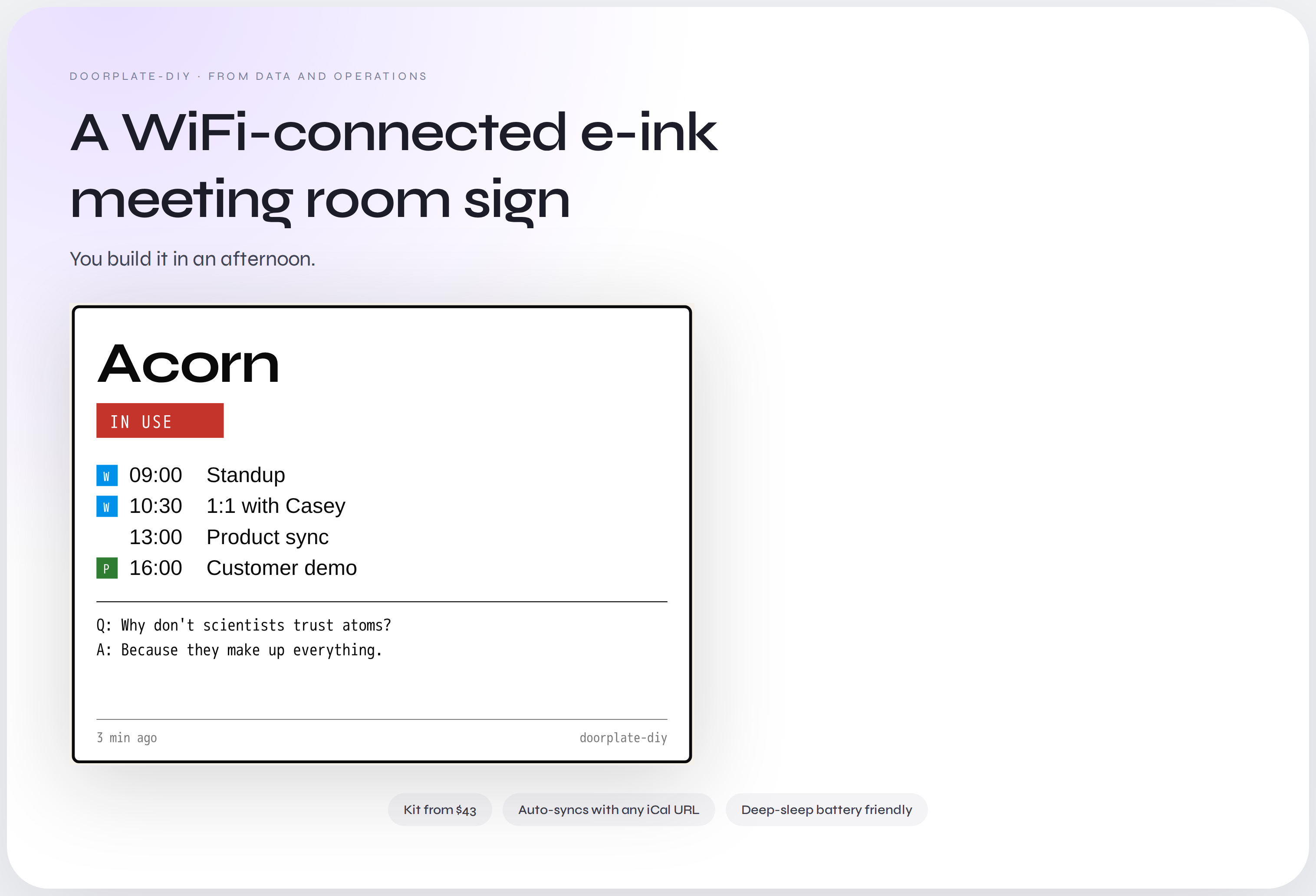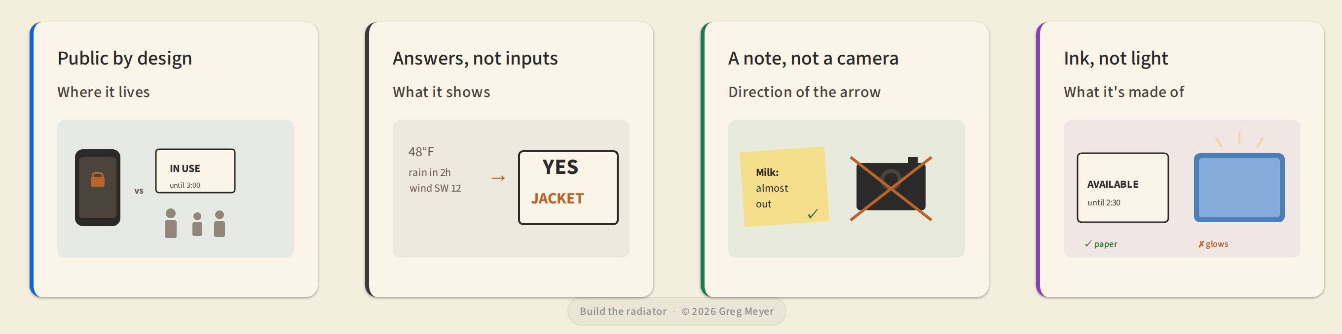 Public by design, answers not inputs, output-only, paper not light — those four rules apply cleanly to each one. I’ve shipped a door sign that solves the “is Dad on a meeting” problem for my household.