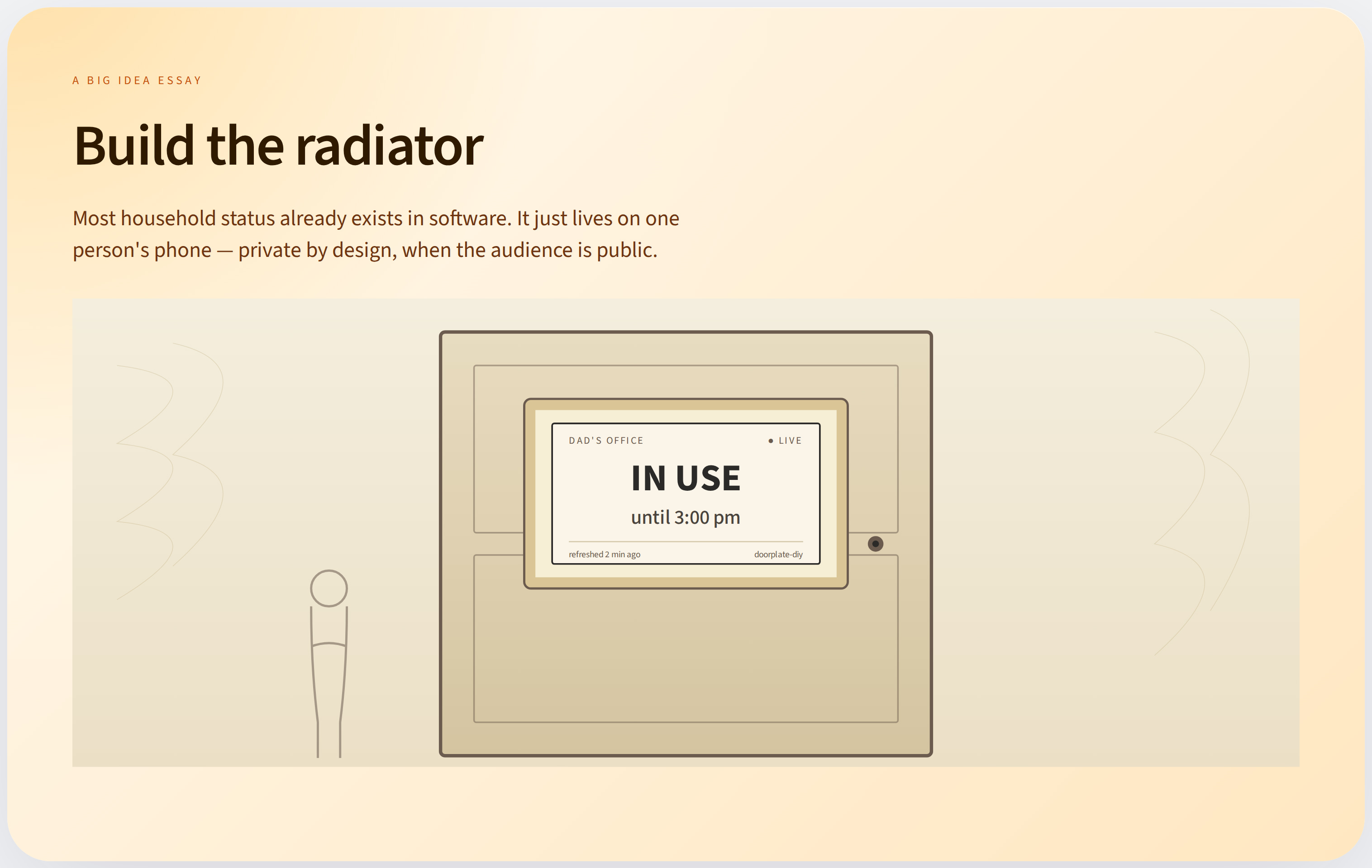 What’s the takeaway? The test is simple: if a piece of household status has to reach more than one person in the room, it belongs on an object, not a phone. The doorplate example is one idea … you could build more.