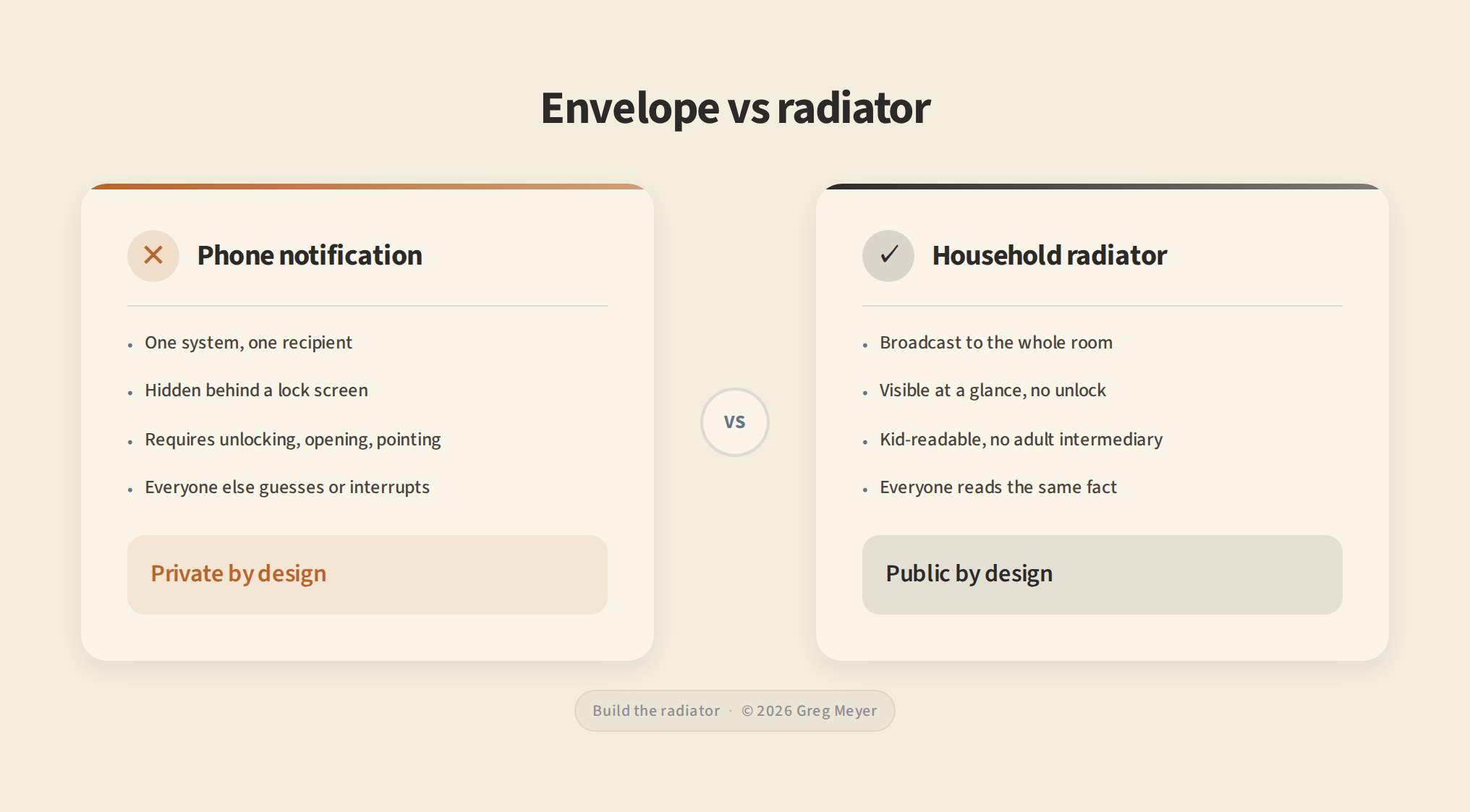 The test is simple: if a piece of status in your house has to reach more than one person in the room, it belongs on an object, not a phone. Phone notifications are private by design. A radiator is public by design. Match the medium to the audience.