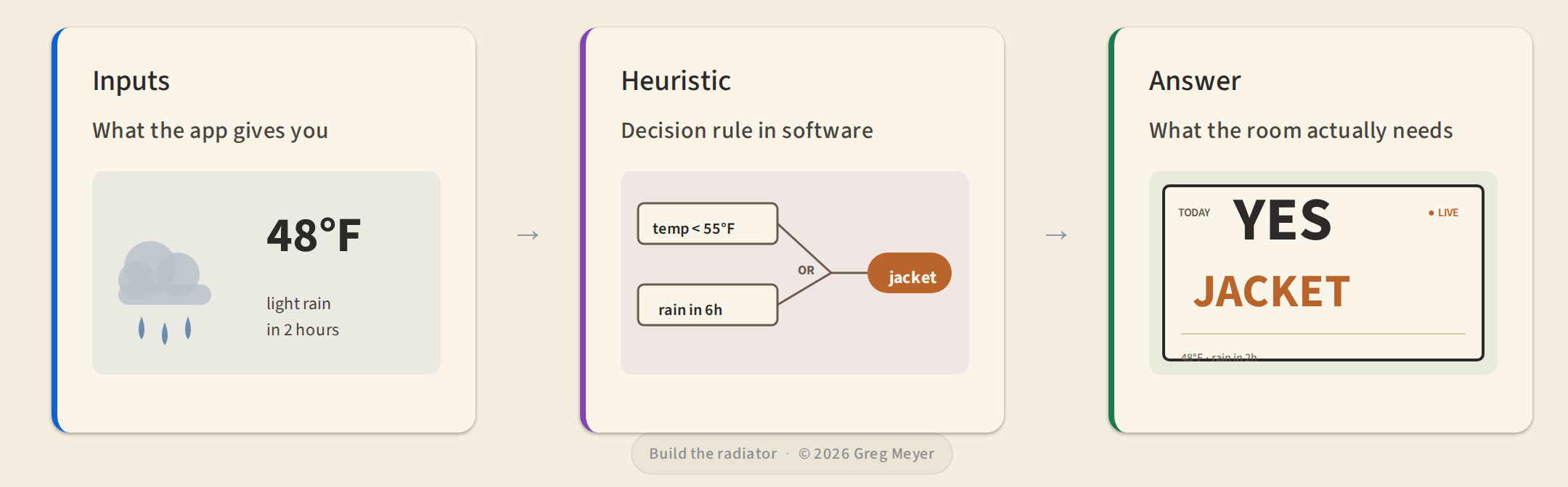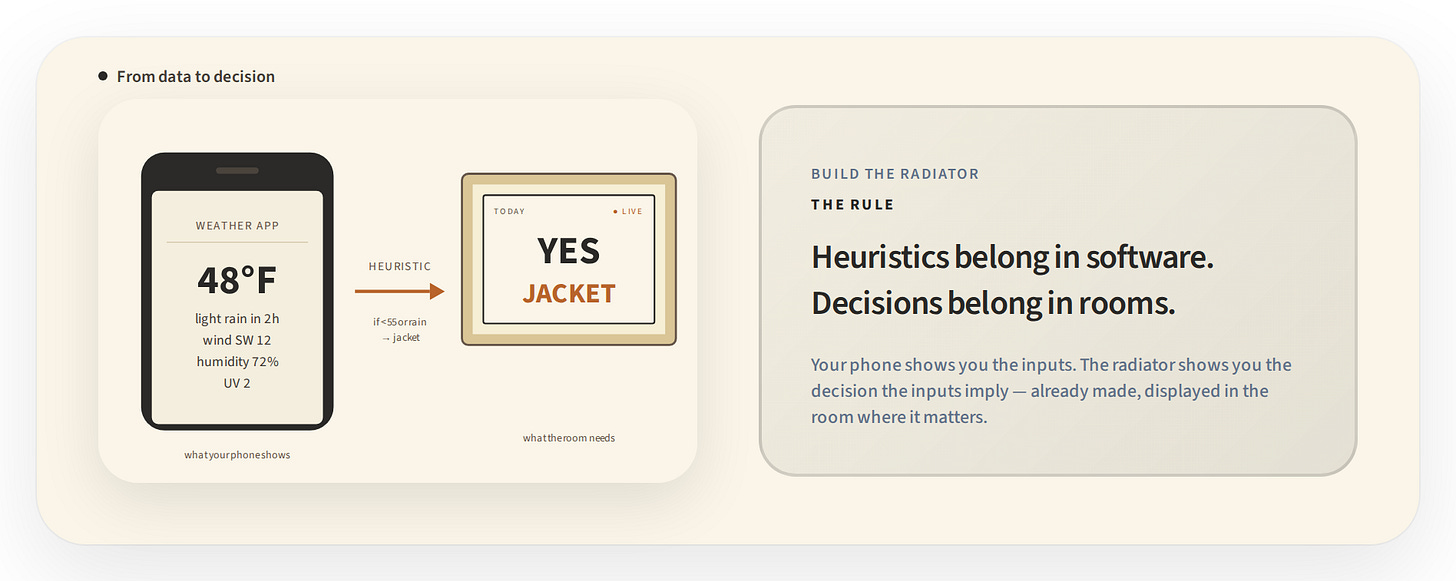 The value of a radiator is that somebody — or some small piece of software — has already run the heuristic, and what lives in the room is the output. Not 48°F, light rain in two hours. YES JACKET. Not three meetings before 3 p.m. with gaps. IN USE UNTIL 3:00. Not leftovers, chicken breast, spinach, half a jar of pesto. TONIGHT: CHICKEN PESTO PASTA.