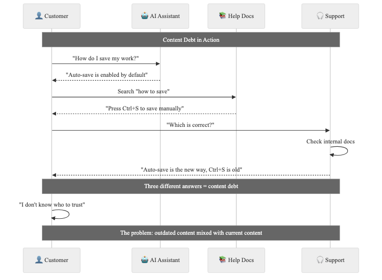 And that's what a lot of content systems at organizations look like today. There is an effort to develop items like prompts, help center articles, and internal docs, and there's much less effort to keep them up to date.