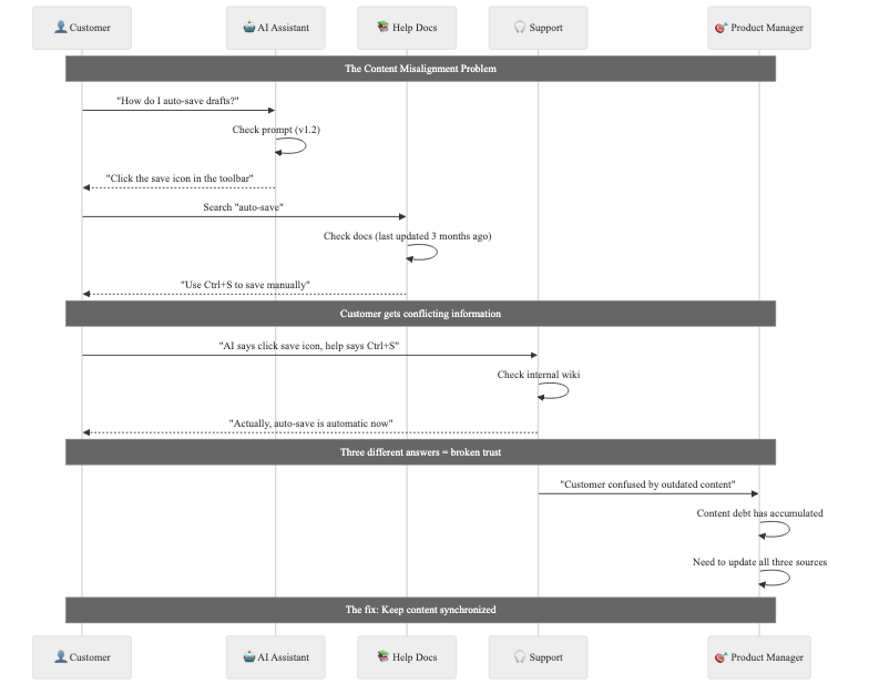 Keeping context across multiple objects might be the biggest challenge facing content managers. A product update may touch a prompt, a help center article, and an internal policy. If those don't stay aligned, trust evaporates.