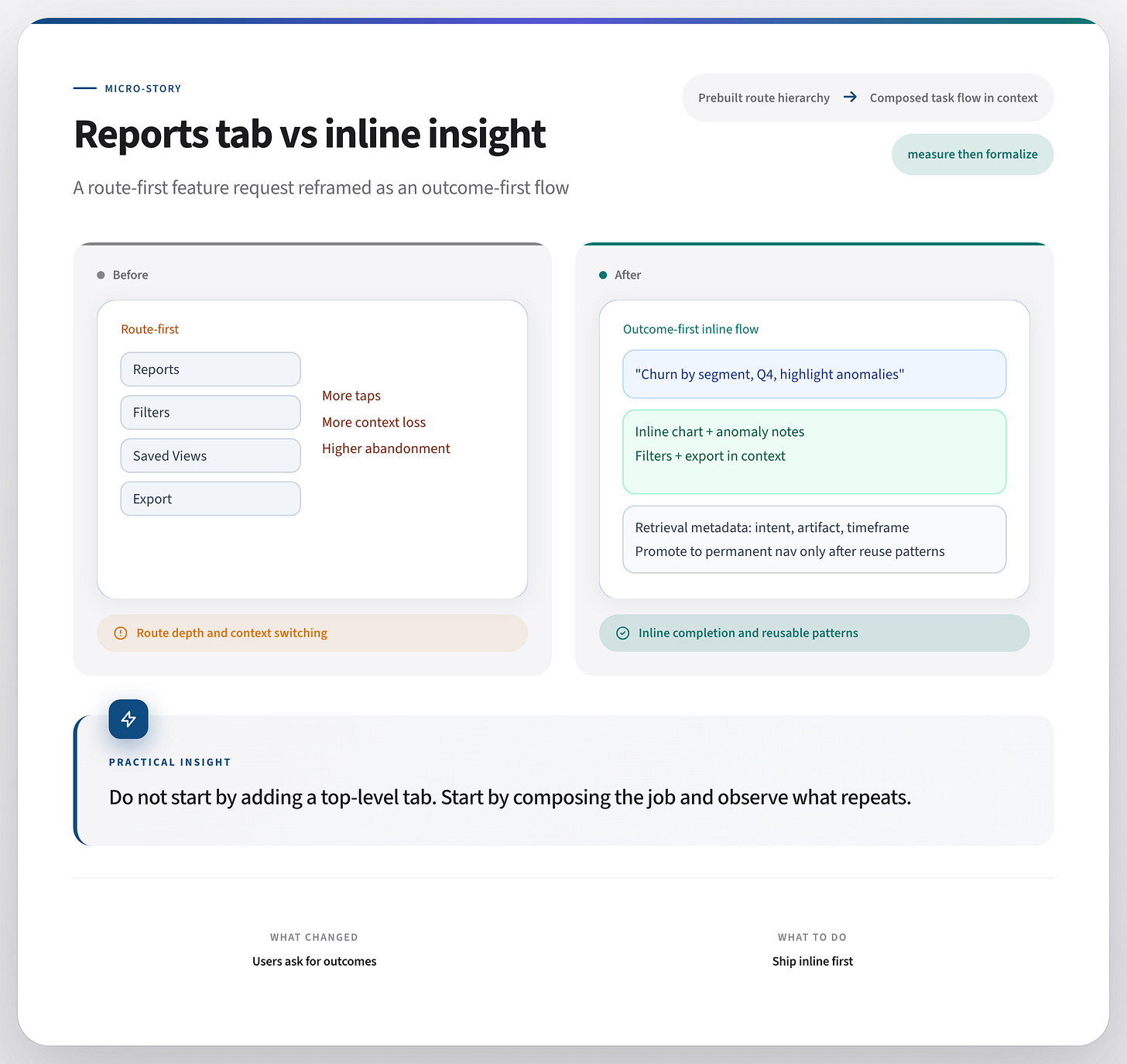 What’s the takeaway? If navigation slows users down, compress it. If composable intent layers reduce friction, ship them. Then measure what changes.Let the path form inside your product before you pave it.