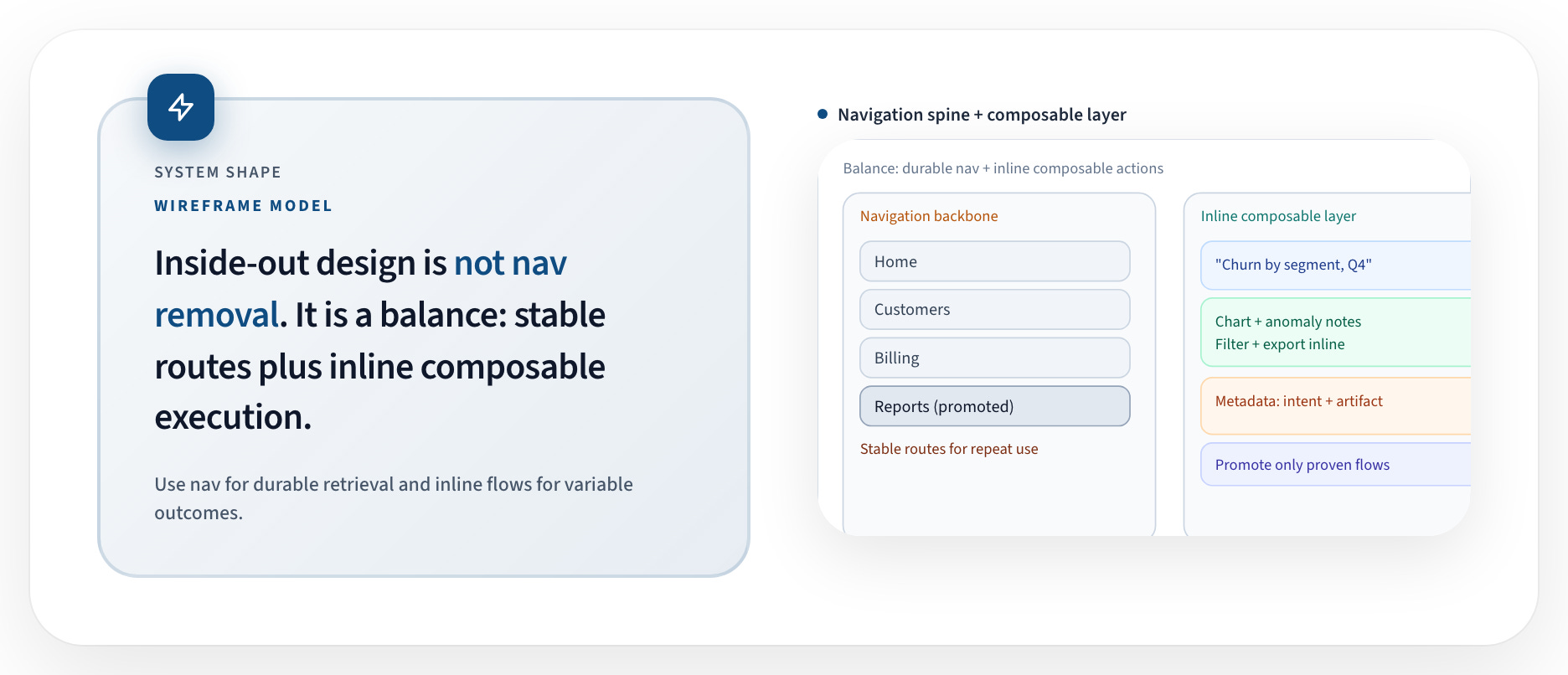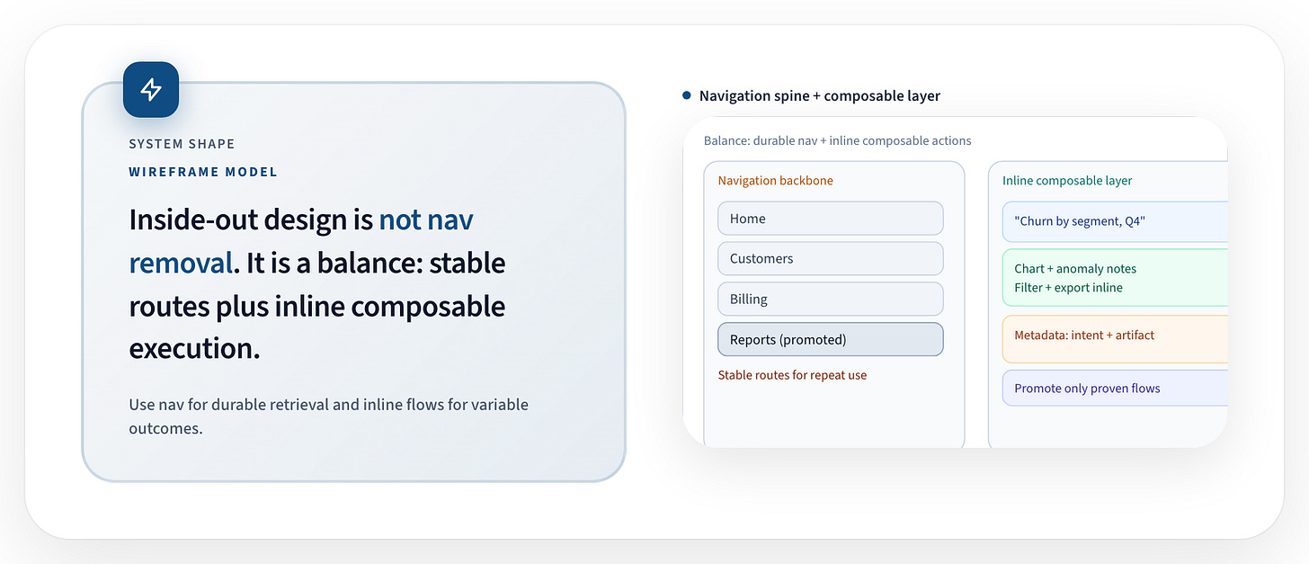 Because orchestration remains observable, teams can measure which actions cluster together and which compositions correlate with successful outcomes. Navigation becomes something derived from behavior rather than imposed upfront.