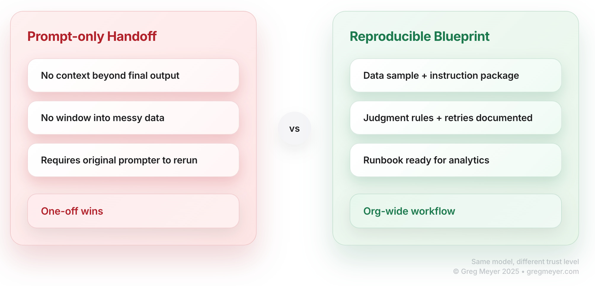It’s tempting to share a raw prompt and say “try this out”. But a reproducible template has a few more items to be solved. Analytics teams need the whole shape of what happened.