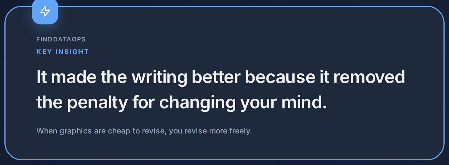 But that is exactly what most writers do with their article graphics. They treat every visual as a one-off craft project instead of a repeatable output. And then they stop revising because the cost of updating the graphics is too high. The design tool becomes a tax on iteration. The more graphics you have, the heavier the tax, and the less you revise.