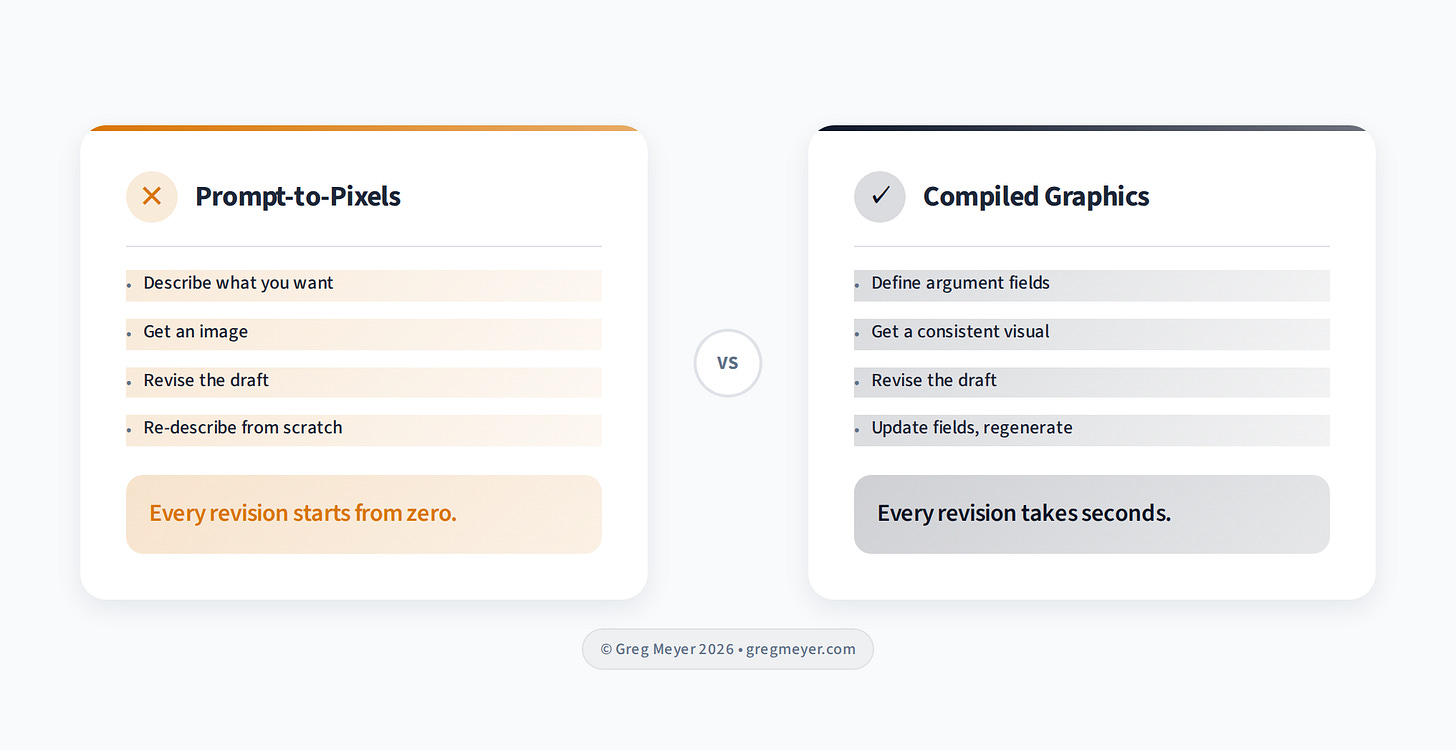 The problem is that writing is iterative and publishing is unforgiving. You need graphics that hold their structure while your message changes. With prompt-to-pixels generation — the “make me an image of this” approach — the result drifts every time. Fonts shift. Spacing varies. Comparisons stop lining up.