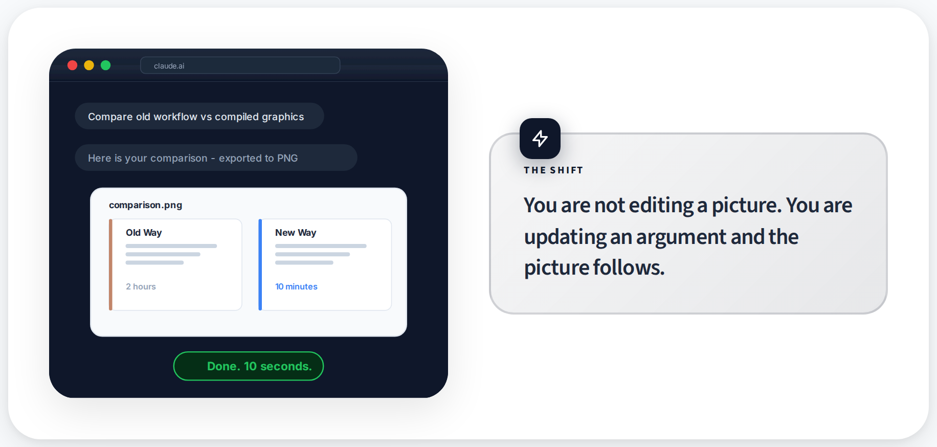 This is the same principle that makes Markdown work for writing. You do not choose font sizes in Markdown. You mark a heading as a heading and the renderer handles the rest. Compiled graphics work the same way. You mark a comparison as a comparison and the layout engine handles the visual structure.