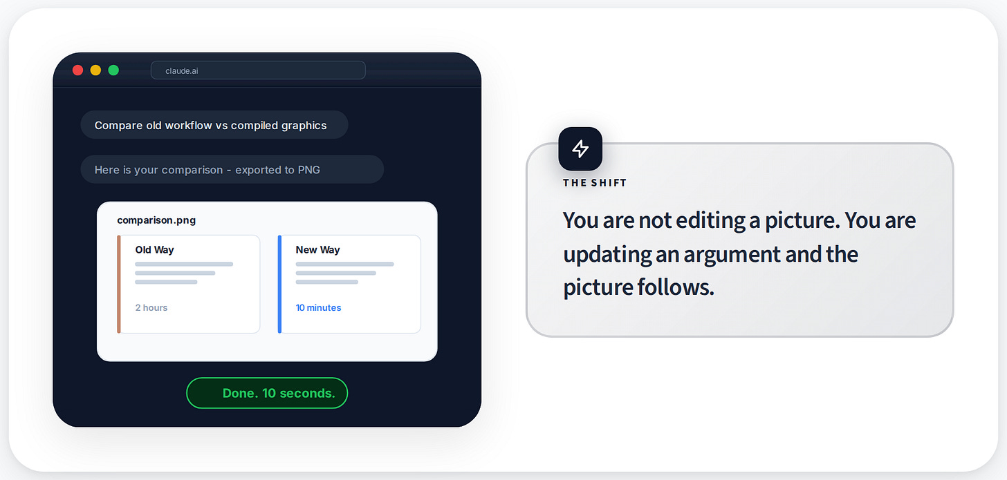 When your graphics compile from your argument, your revision loop never breaks. The visuals stay current because they have no choice. They are downstream of the words.