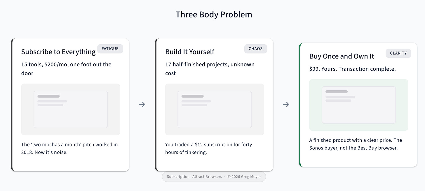 The software market has three options now — subscribe, build it yourself, or buy once. Only one filters for real buyers. Read: "Everything starts looking like a toy" #297