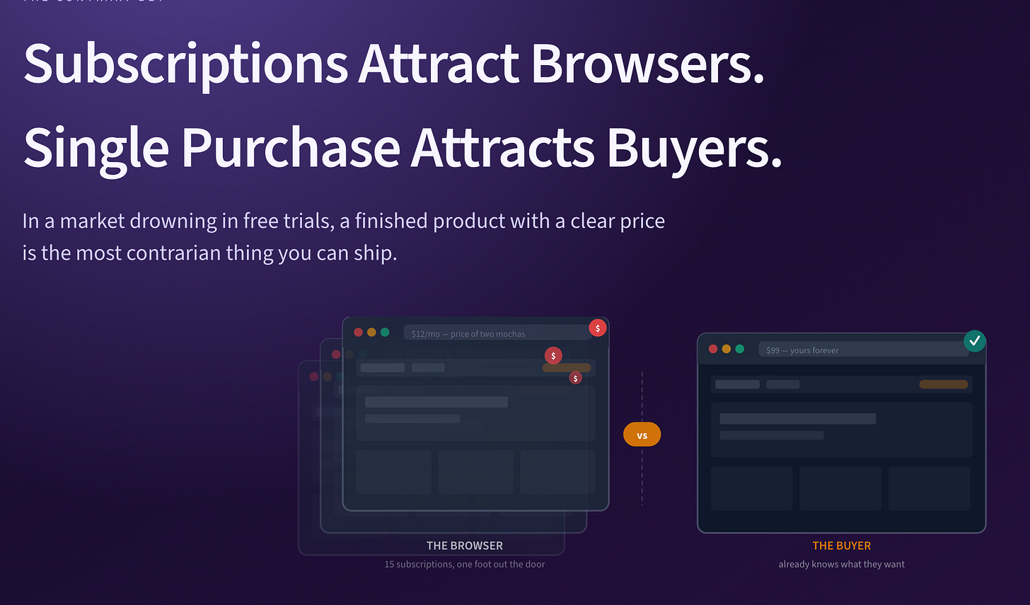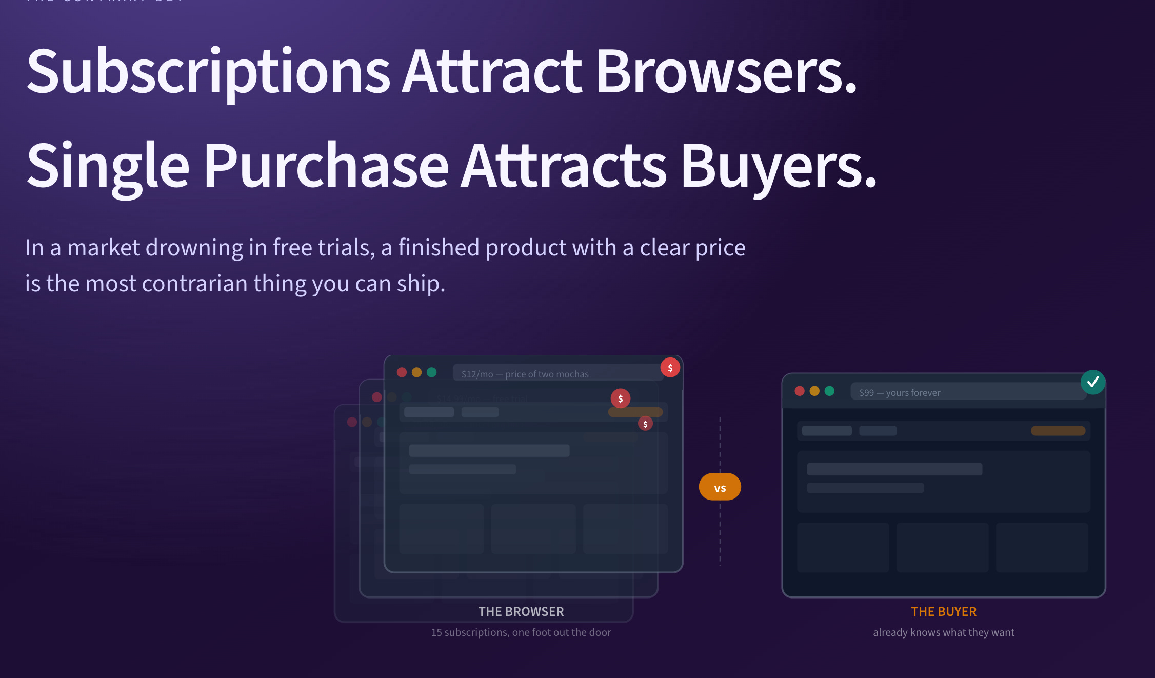 It creates a moment where the buyer pauses and thinks: wait, I just pay once?That pause is worth more than a thousand optimized onboarding flows. For a growing category of tools — the ones that do a specific thing well, that live locally, that solve a bounded problem — the contrary bet is worth making.