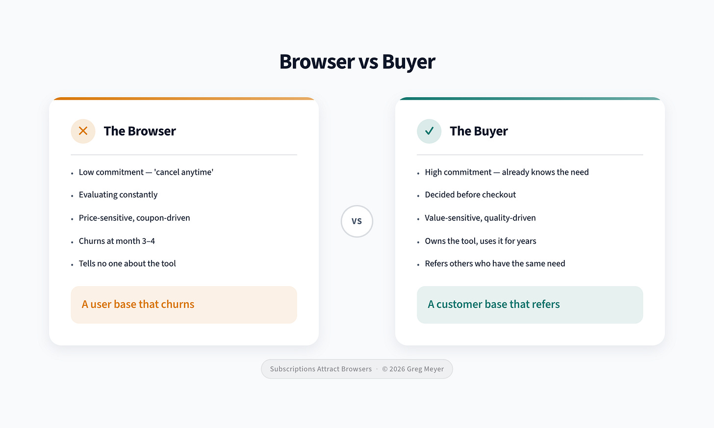 Subscription attracts people who are willing to try. Single purchase attracts people who are ready to buy. Those produce fundamentally different businesses. One gives you a user base that churns. The other gives you a customer base that refers.