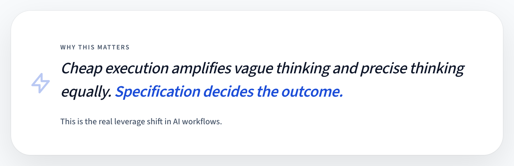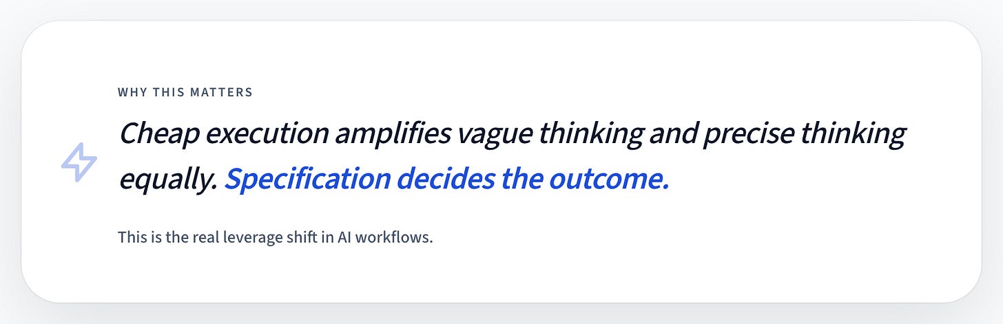 When your specification is vague, AI fills gaps with plausible noise. When your specification is sharp, AI gives you structured leverage.
