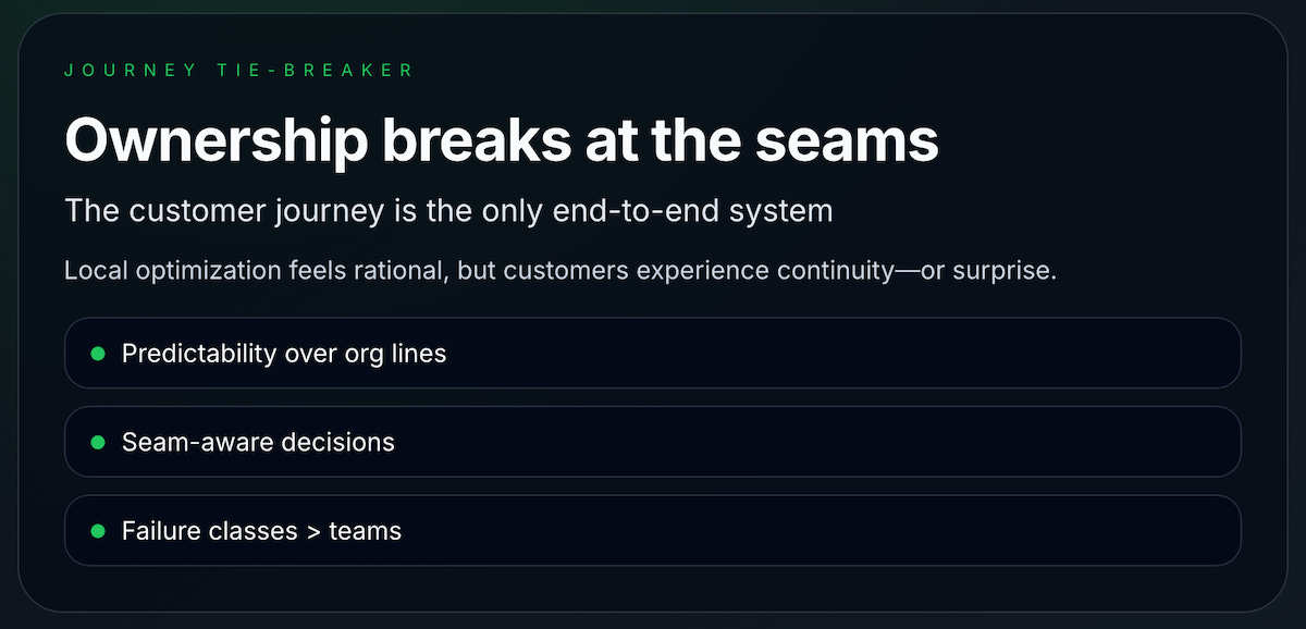 Once you anchor failure to the journey, debates about ownership become easier. Teams may still disagree on fixes, but they can agree on whether a decision preserves continuity or introduces surprise.