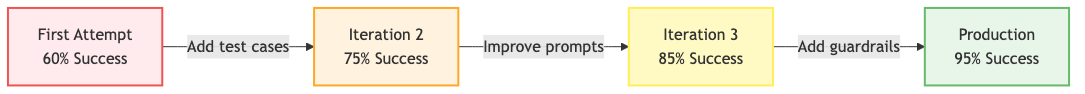 Your first attempt might only work 60% of the time. Your classifications might be inconsistent. Your summaries might miss key points. But here’s the thing: unlike traditional software, AI systems improve dramatically with iteration.