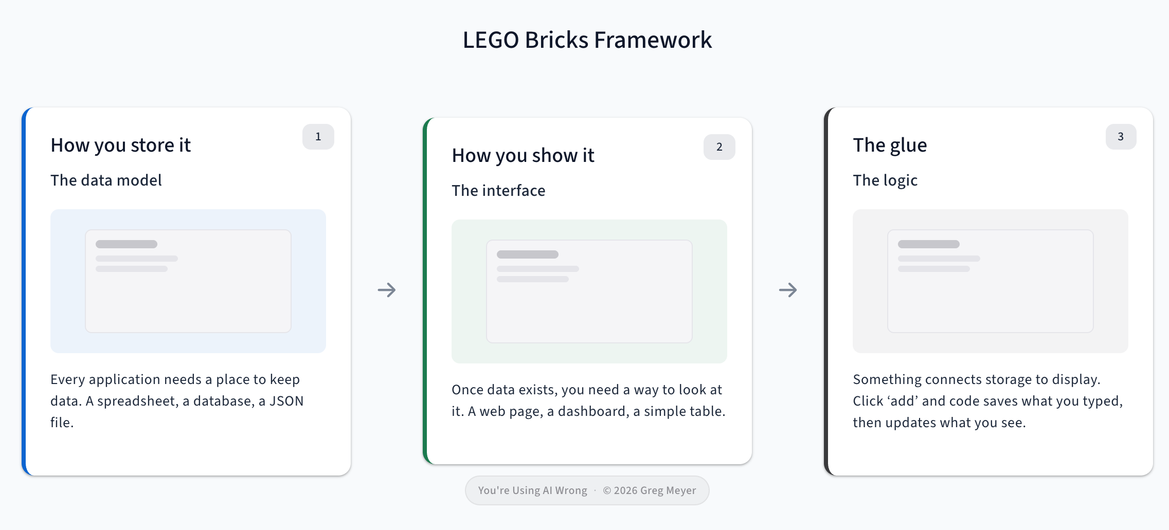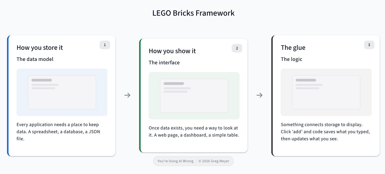 How you store it. Every application needs a place to keep data. A spreadsheet, a database, a JSON file. When your friend says “I want to track my reading list,” the first LEGO brick is: where does the list live?